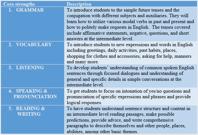 This program has been designed to provide acquisition of the English language to non-English speakers worldwide. This virtual program will be utilized through a computer screen. Via this screen, students will be able to read marked grammar structure, watch a brief video clip to reinforce the new grammar subject, move through a dialogue and practice the different forms of grammar with vocabulary, idiomatic expressions, pronunciation suggestions and at the end, take a general quiz for that level.